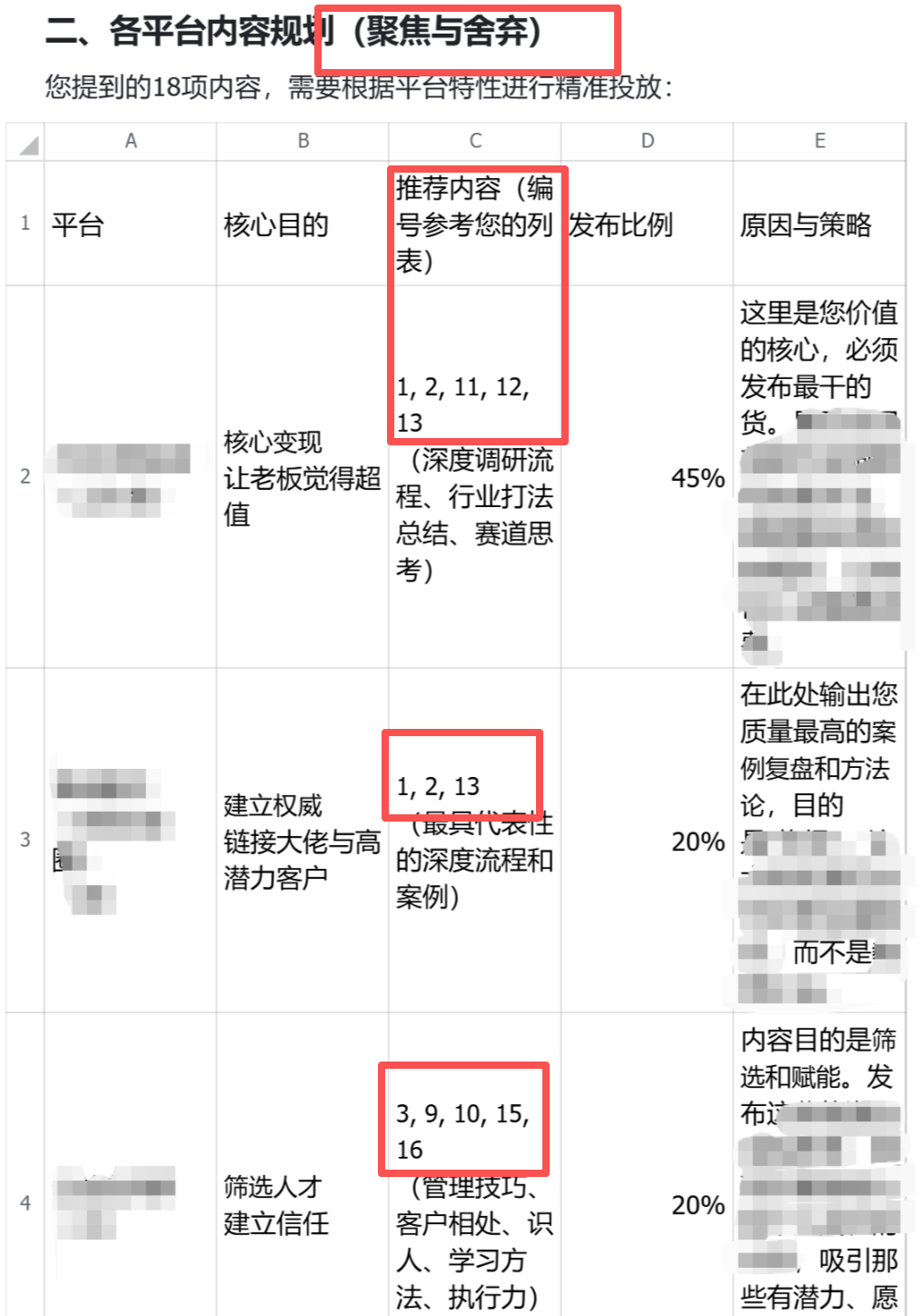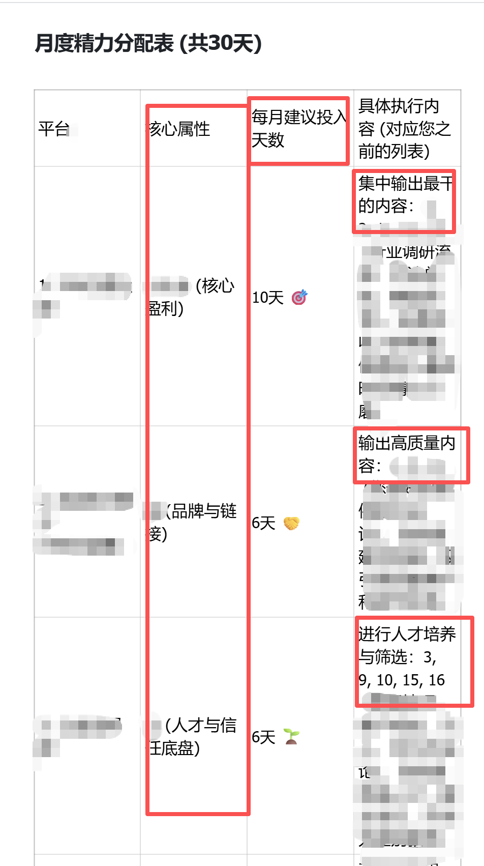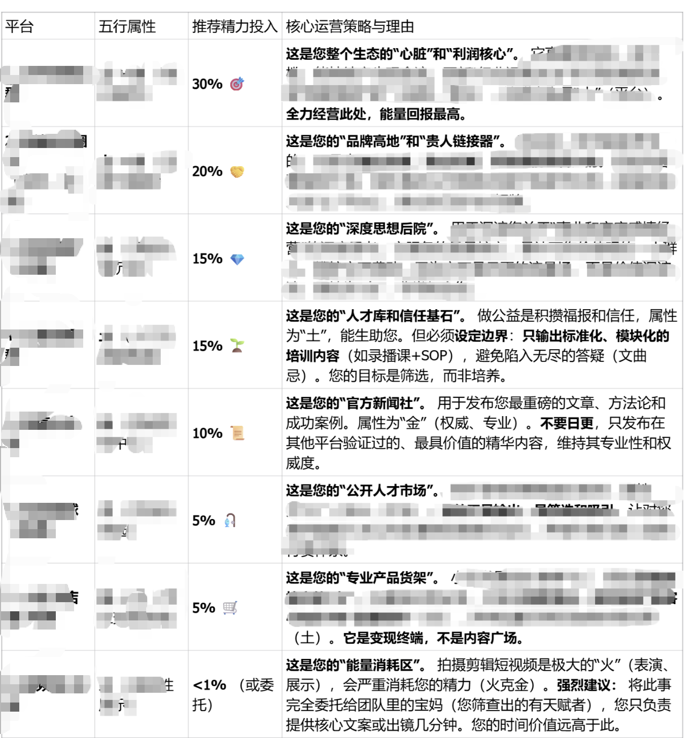 【注:到了这一步,AI往往会给你放大招,直接给你做了一个超级完整的表格,把你每个平台要放的精力全部说出来了。】