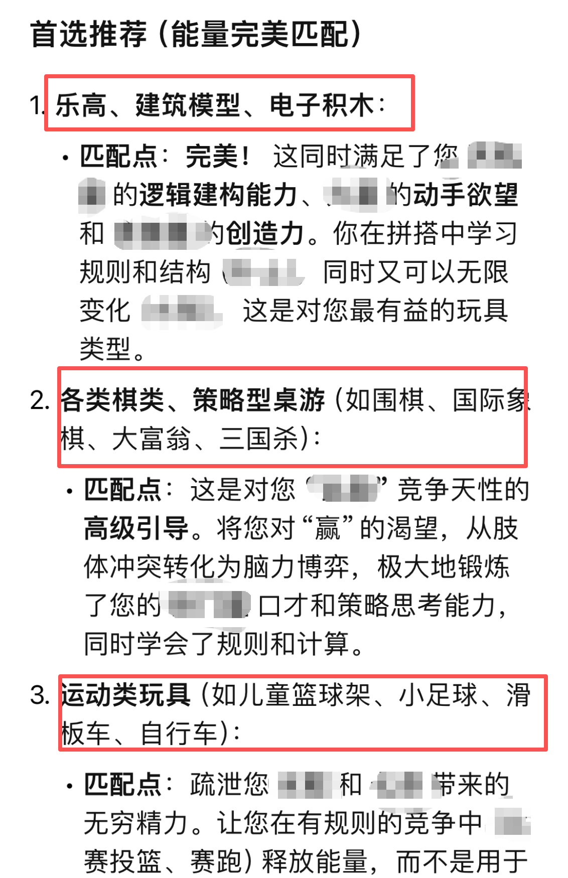 结果准到我大跌眼镜,deepseek测出来的玩具,全是他平时喜欢玩的。