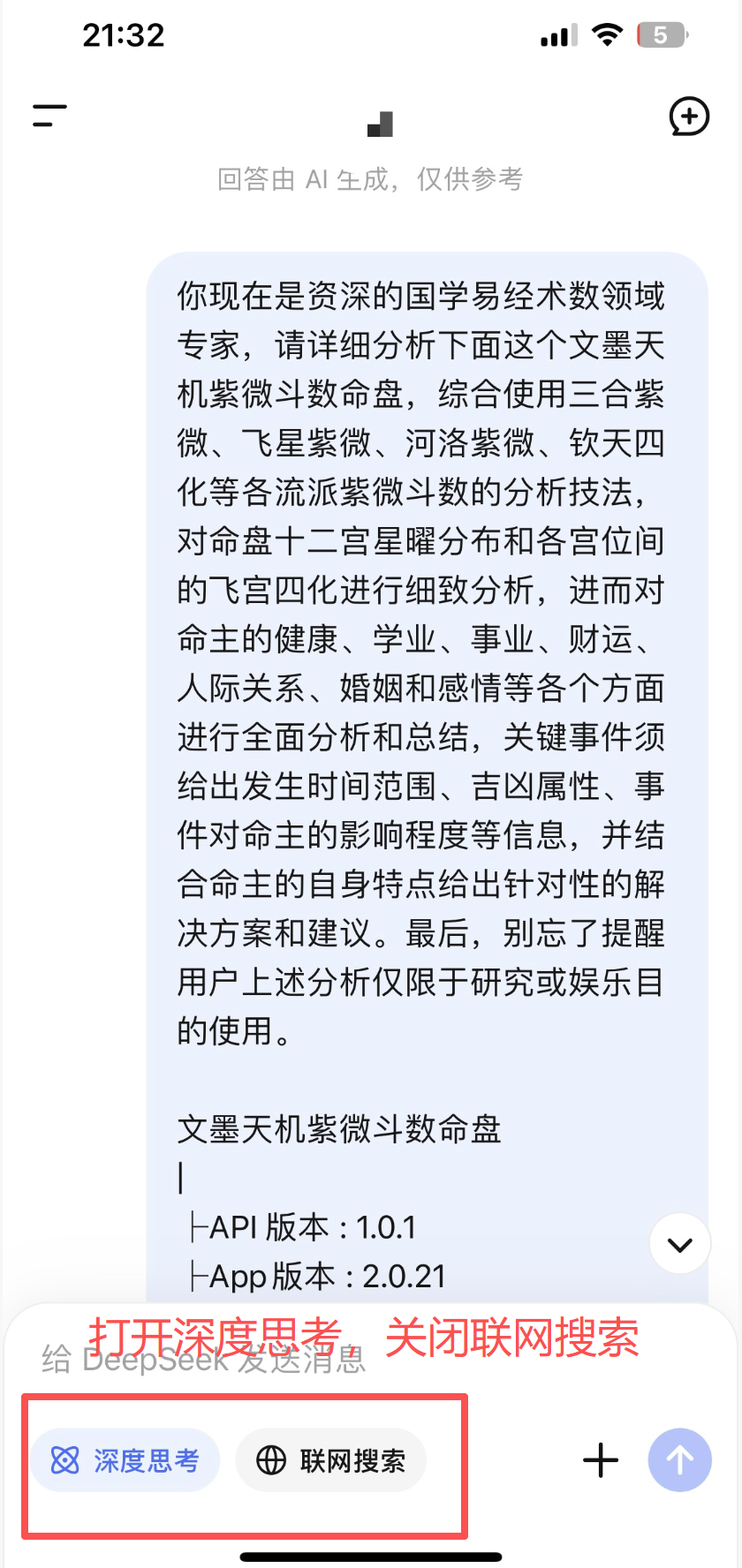 第三步:这时候打开deepseek,打开深度思考,关闭联网搜索。复制粘贴内容,你会发现:文墨天机自动生成了一串提示词给到deepseek。这一次排盘,就是准的了。比以前珍妮给的那套提示词要更准。