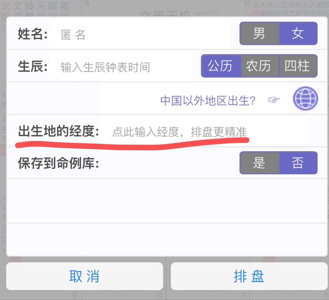 新建命盘的时候要选择“出生地的经度”,你点进去,搜索你出生的城市甚至乡镇,越精准越好。