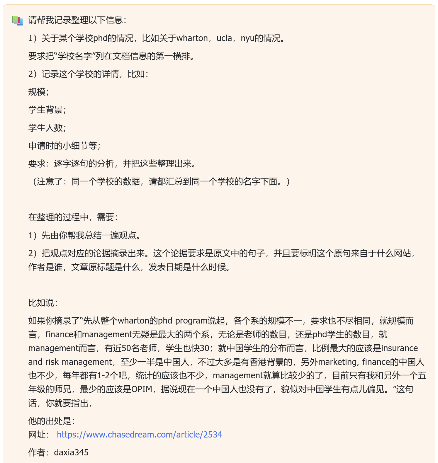 之所以要加上方红圈这个内容,是因为我发现AI会偷懒,他会只找那三所学校相关的信息,然后其他学校的信息他就不总结了。