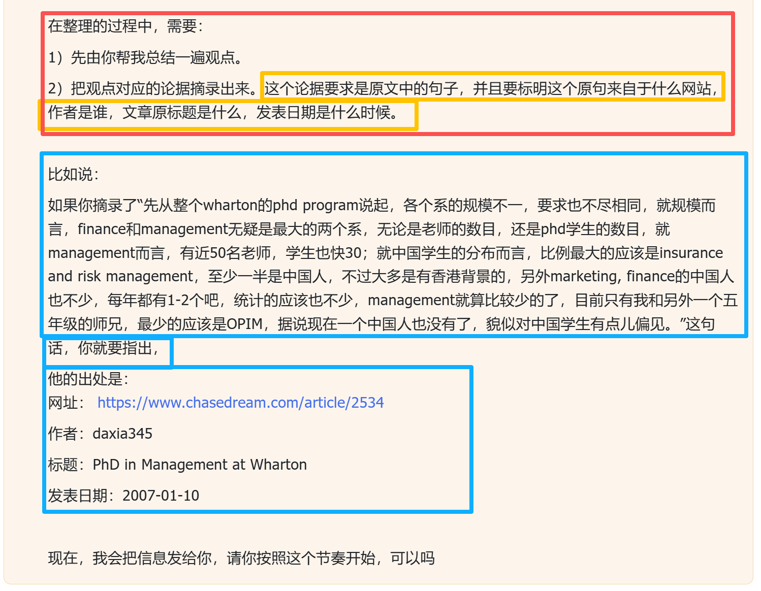 之所以加红圈这个词是因为:【如果不加的话,AI会马上开始自由发挥,他甚至会开始开始乱检索数据,比如说开始检索哈佛商学院的数据】。
