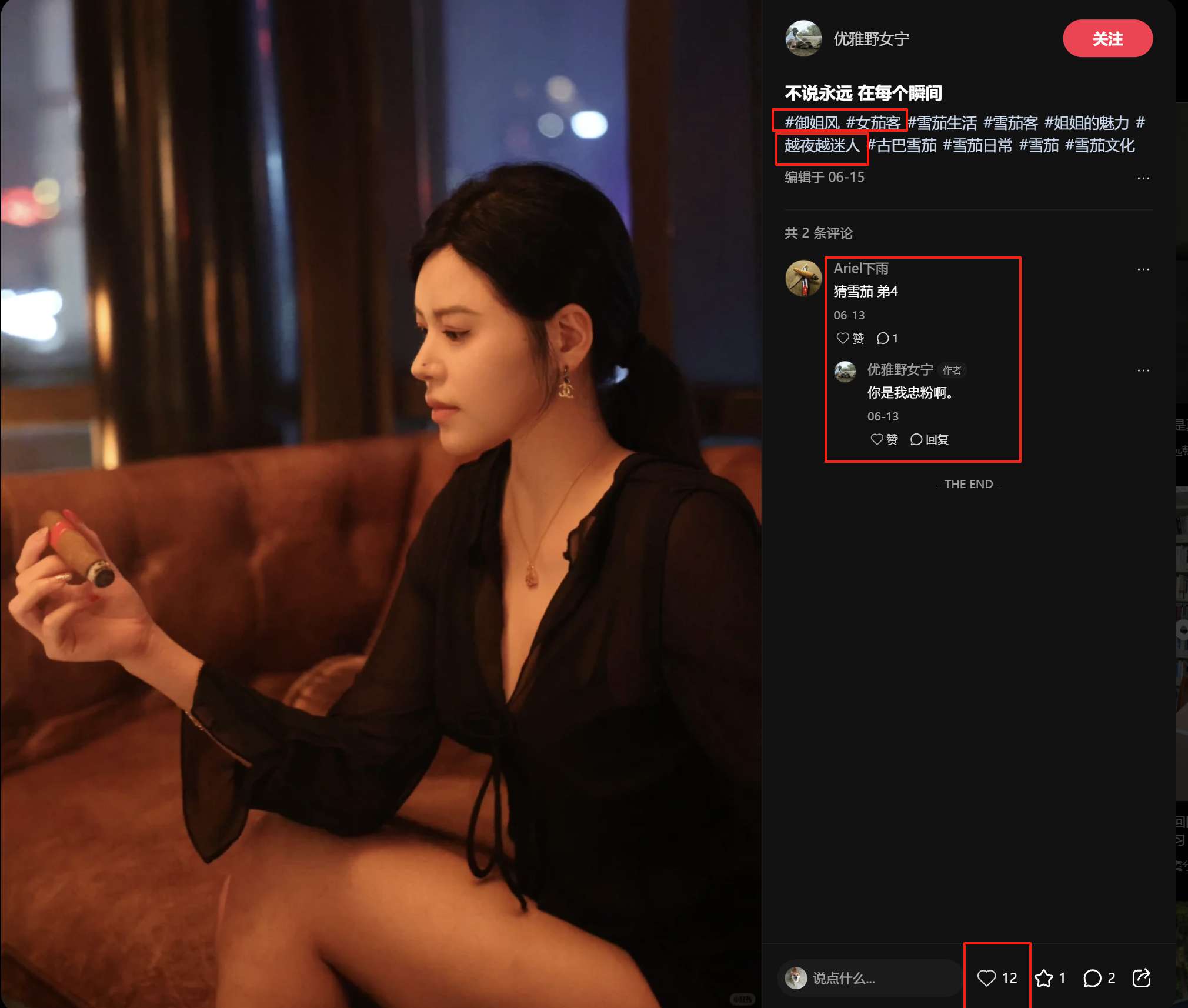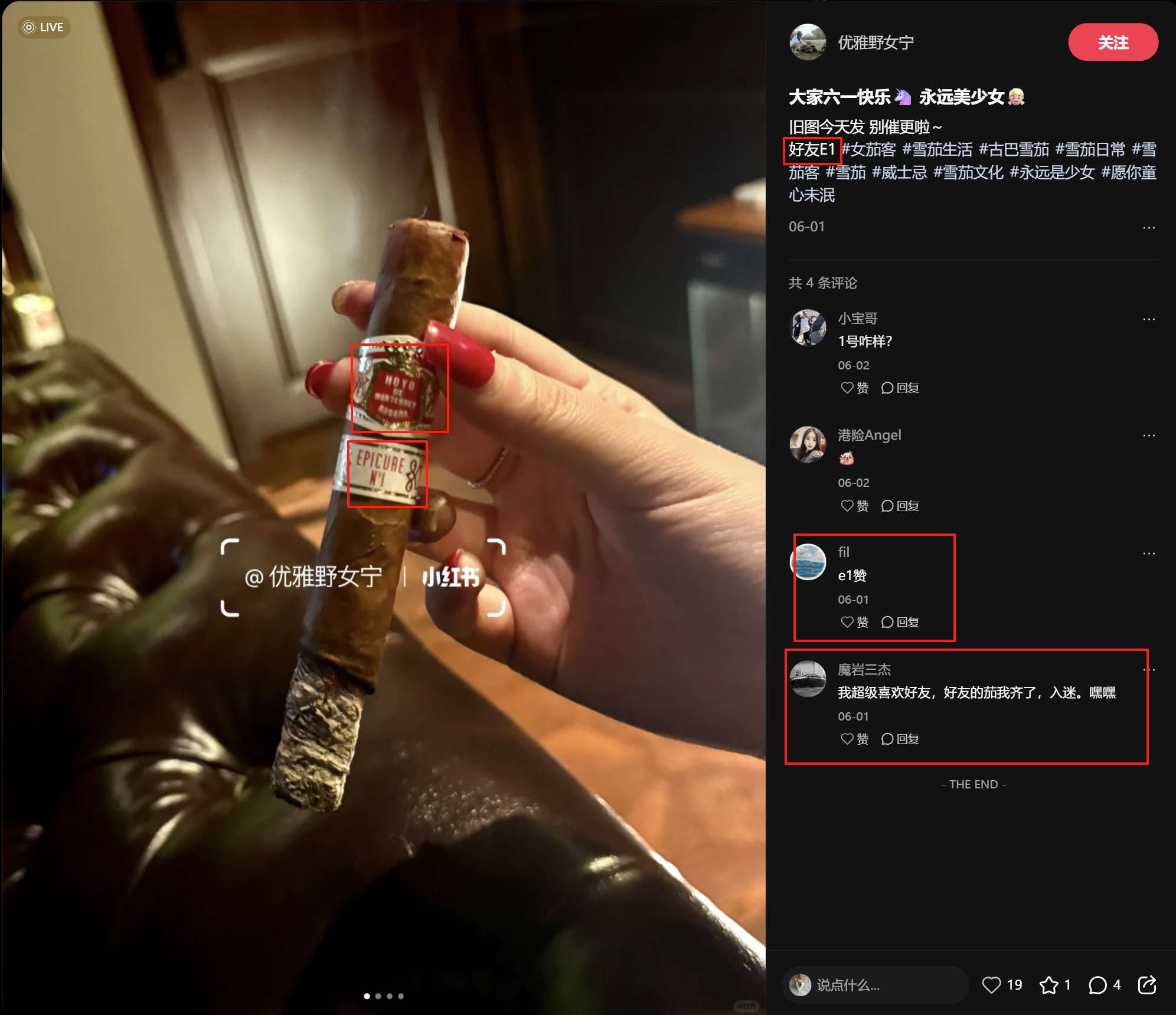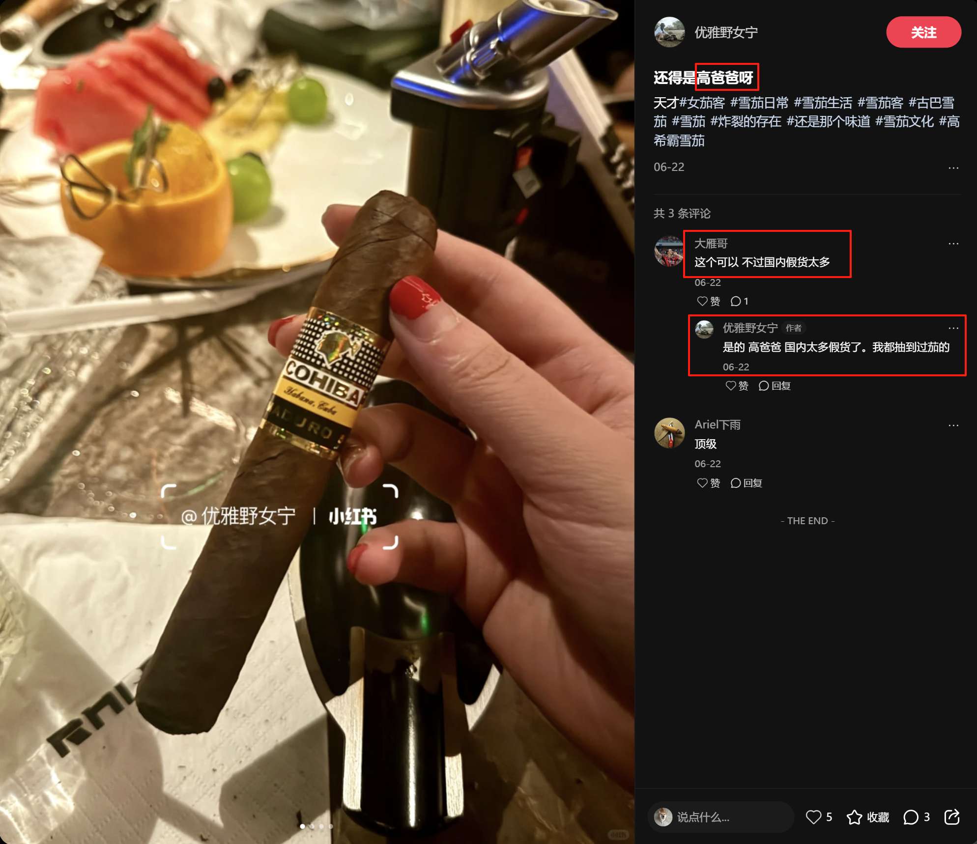注意文案里标签处的“雪茄客”“女茄客”,基本把这个赛道的笔记看得多了,就会发现这两个标签很吃香,来的客户也更精准。