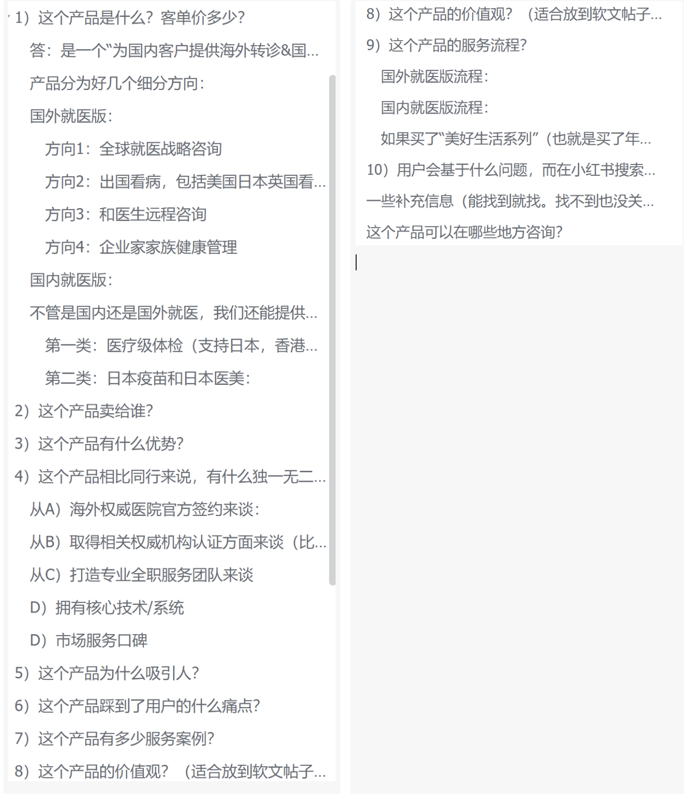 1)用户的家庭年收入一般是多少? 2)用户是什么年龄段?30?40?50?60?70? 3)用户的职业和过往从业经历?比如银行家?比如XX公司高管?比如? 4)用户得的是什么病?比如喉癌?肺癌?得不同病的比例是多少?比如100个人里,几个人得喉癌?几个人得肺癌? 5)用户在哪些医院已经问诊过、治疗过啦?(比如看过哪些国内外医院?) 6)用户为了看病,以往花过多少钱了?他还准备为了看病花多少钱?(在把衣食住行的费用全部算上的基础上) 7)100个人里,几个人买了“全球就医战略咨询产品”? 几个人买了“出国看病服务产品”,他们买不同国家看病产品的比例分别是多少?比如几个人选择美国看病?几个人选择英国日本? 几个人买了和医生远程咨询的产品?买国内咨询和国外咨询产品的比例分别是多少? 几个人买了企业家家族健康管理产品?都是什么行业的企业家买的?比如互联网?建筑?芯片? 几个人买了年会员卡?他们买了年会员卡后去消费了吗?消费的频率如何? 8)以上买单的用户里,男女比例是多少? 9)买单的用户,平时喜欢刷什么平台?小红书?视频号?公众号?抖音?还是说根本不刷自媒体,全靠周围人介绍? 10)用户来咨询我们的时候,喜欢咨询哪些问题?我们是否有做具体分类? |