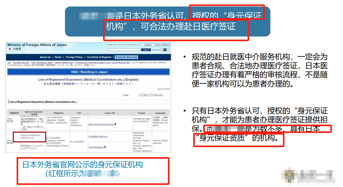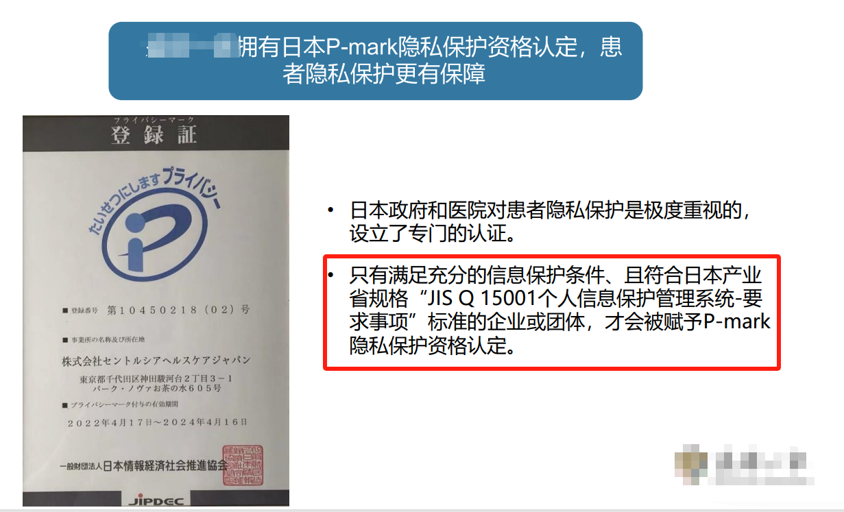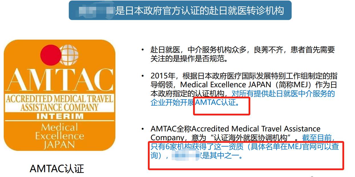 从B)取得相关权威机构认证方面来谈(比如赴日就医转诊机构里,提供该服务的中介需要取得AMTAC认证。我们是6家取得资质中的一家),是为数不多的,具有XX保证资质的机构,且拥有XX隐私保护资格认定。