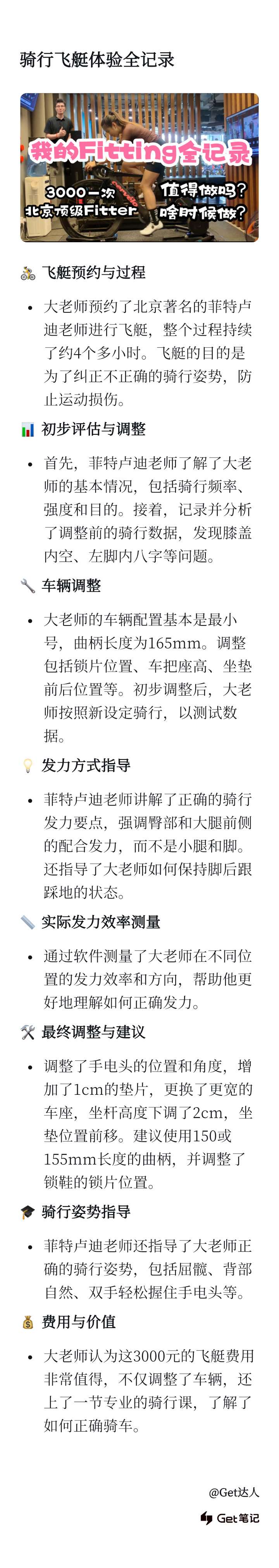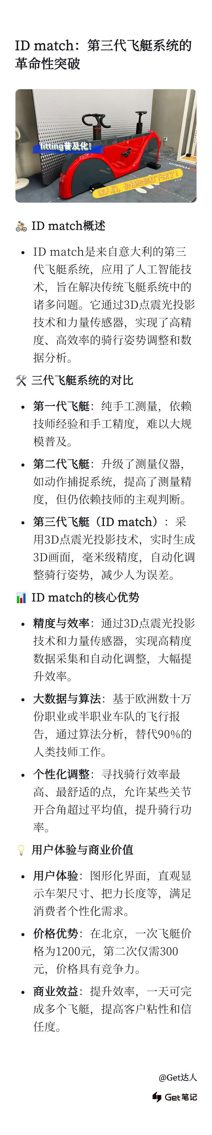 这类笔记如果被金主爸爸刷到了,会觉得我们不专业,甚至会觉得我们笔记影响了对方品牌的口碑,这会导致我们丧失后面的代运营机会。 | 第三代fitting就牛逼了,因为不需要贴点了,客户站在摄像头面前,就可以实时生成2D画面,完成数据采集,而且精确度是毫米级。 第三代fitting是有欧洲10万份职业或者半职业车队的骑行报告作为数据支撑的,在算法加持下,可以替代90%的人类技师的工作。 |