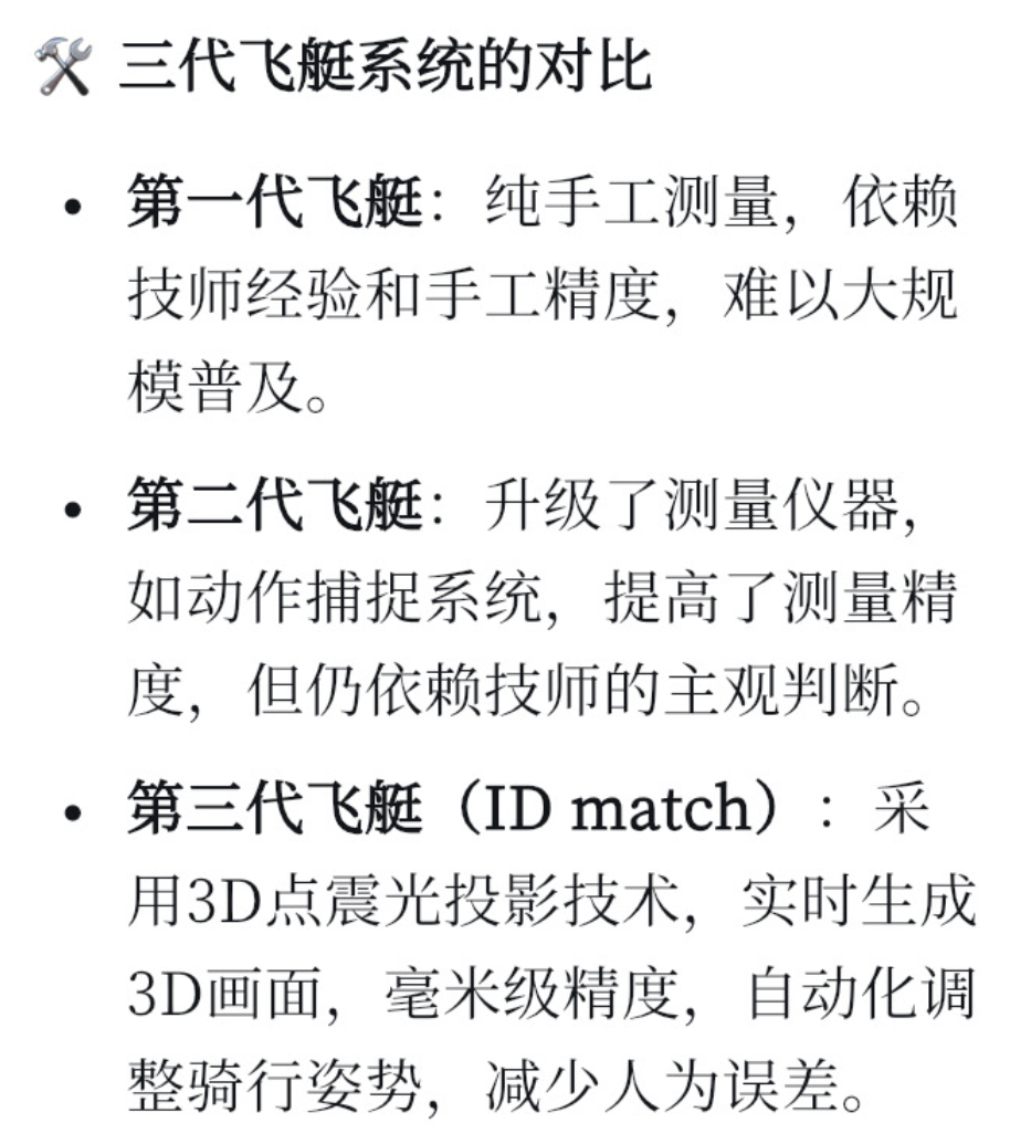 把fitting价格狠狠打下来!ID match第三代飞艇来搞事了 您现在看到的这辆没有轮子的自行车,它就是来自意大利的应用了人工智能技术的第三代飞艇,设备叫做ID match. 那前两代的飞艇跟第三代飞艇有什么区别呢?第一代飞艇就是纯手工测量,我们在意大利的PG的工作室见识过这种飞艇,它本身是科学的,但是它严重依赖技师的经验和手工测量的精度,所以,难以大规模普及和推广,因为职业车队的需求,第二代飞艇应运而生。它本质上就是把尺子升级成了精度更高的测量仪器,例如动作捕捉系统等等。然而,无论多么先进的工具,它只是提升了测量精度,它仍然没有解决飞行系统中最大的变量,那就是技师。我们可以举一个例子啊,很多人可能知道,我们弗轮单车是最早将飞艇引入大陆的车店。即便如此,在我们招收的飞艇技师中,2。 两个技师面对同一个顾客的时候,仍旧会做出两种截然不同的论断。这是因为每个技师的主观能动性不一样,经验不同,侧重点也不同,最终导致数据和结果没有统一性。而第三代飞行系统除了一些技术上的升级,人性化的调整之外,最核心的改变就是解决了人的问题。ID, match首先解决的是传统飞行中手工贴点导致的误差问题。在ID match上采用了跟苹果非4ID同源的3D点震光投影技术,顾客只需要站在摄像头前面就可以实时生成3D画面完成数据采集,并且精度是毫米级的。其次呢,ID ma解决的是传统飞艇中效率的问题。在ID match的虚拟车内有十几个力量传感器,它可以实时的、动态的去调整你的骑姿,并且将数据交给计算。 机去判断,而传统的飞艇呢,则需要飞艇技师手动去调整你的座舱位置等等等等。那么,整个过时过程费时费力,而且呢,效率也远远比不上自动化的机器。最后呢,ID match解决的是传统飞艇中技师的判断力和经验的问题。ID match所仰仗的呢,是来自欧洲数10万份职业或半职业车队的飞行报告,作为他们大数据的支撑,在算法的加持下,它几乎可以代替90%的人类技师的工作。同时呢,ID match的理念也更为先进。传统的飞行技师会将你的各个关节的开合角控制在一个平均值以内,以此达到一个良好的优秀的数据。但是ID match并不会这么做,它通过机械传感器,通过大数据,通过几十万份报告的分析,他会认为,我要寻找的是你坐在虚拟车上那个效率最高的点,最舒适的点。只要你能保证。 更舒适和高效率,它甚至会允许你某些关节的开合角超过平均值。不得不说啊,这种理念其实是更科学、更有效也是更先进的。很多顾客在经过了ID ma的调整之后,功率甚至涨了二三十瓦。当我们见识过ID ma在核心技术上的飞跃之后呢,其实ID match还有很多人性化的东西可以跟大家聊一聊。我们举个例子,你在ID match上飞听完之后可以进入选车的环节。在这个过程中呢,一切界面都是图形界面,你可以直观的看到你应该骑多大的车架,用多长的把力,甚至连垫几个垫圈儿都给你标注清楚了,一目了然。这对于我们这种有点吹毛求疵,有点强迫症的消费者来说,简直是莫大的福音。比方说我想要STS的车架,不需要垫圈儿,那我就可以从ID match15000个车架的数据库中,去选择到那个我刚好不用垫垫圈的完美车型。 那我们可以做个总结啊,ID ma呢,其实就是现在市面上最先进,最准确,最科学,最高效的第三代飞行系统。那ID ma对于我们普通消费者,它意味着什么?除了我们之前提到的这些科技改进之外,其实最关键最有益的一点就是把价格打下来了。现在在北京啊,这种成本比较高的城市,弗轮单车的一次飞艇价格是1200元,如果你在一年之内做第二次飞艇,只要300元,我相信这个价格如果在一些成本更低的城市,它还有下探的空间。对于商家而言呢,ID match也是一笔效益极高的投资。首先效率提升了,过去一天花5个小时做一个飞艇,现在花5个小时能做5个飞艇。其次呢,现在的自行车都是以一体把内走线为主,它对于前期的选码、选尺寸就提出了非常高的要求。如果。 你有ID ma这样的设备,能够帮客户更精准的选好尺码,那相信客户对你的粘性和信任度都会提高。总而言之呢,百闻不如一见,如果大家对这套设备感兴趣,无论你是做飞天的客户,还是希望采购这套设备的商家,都欢迎您来福轮单车坐一坐,看一看,亲身体验一下ID ma的神奇之处。怎么联系我们呢?其实很简单啊,无论是小红书B站啊,私信我们即可。 |