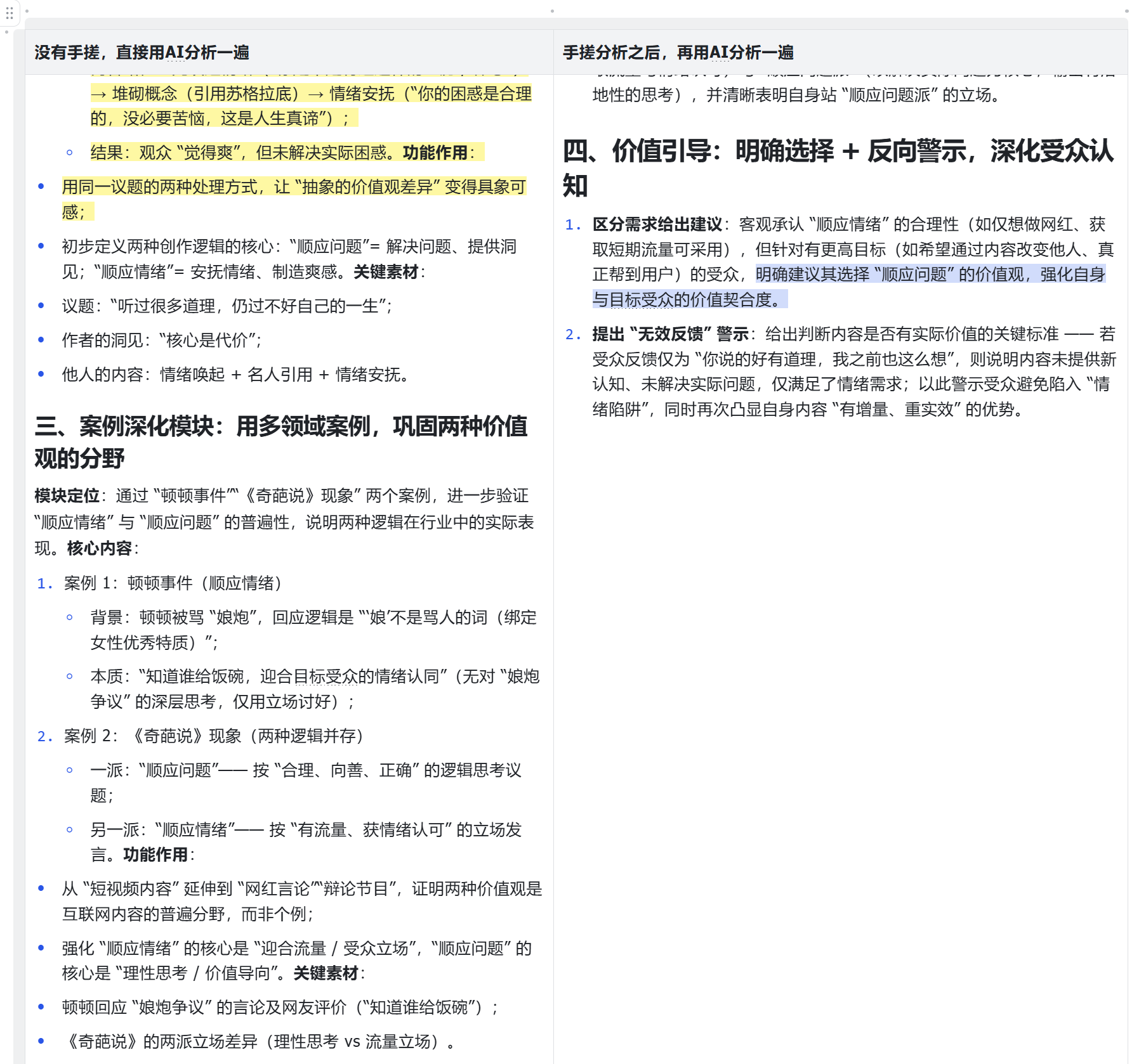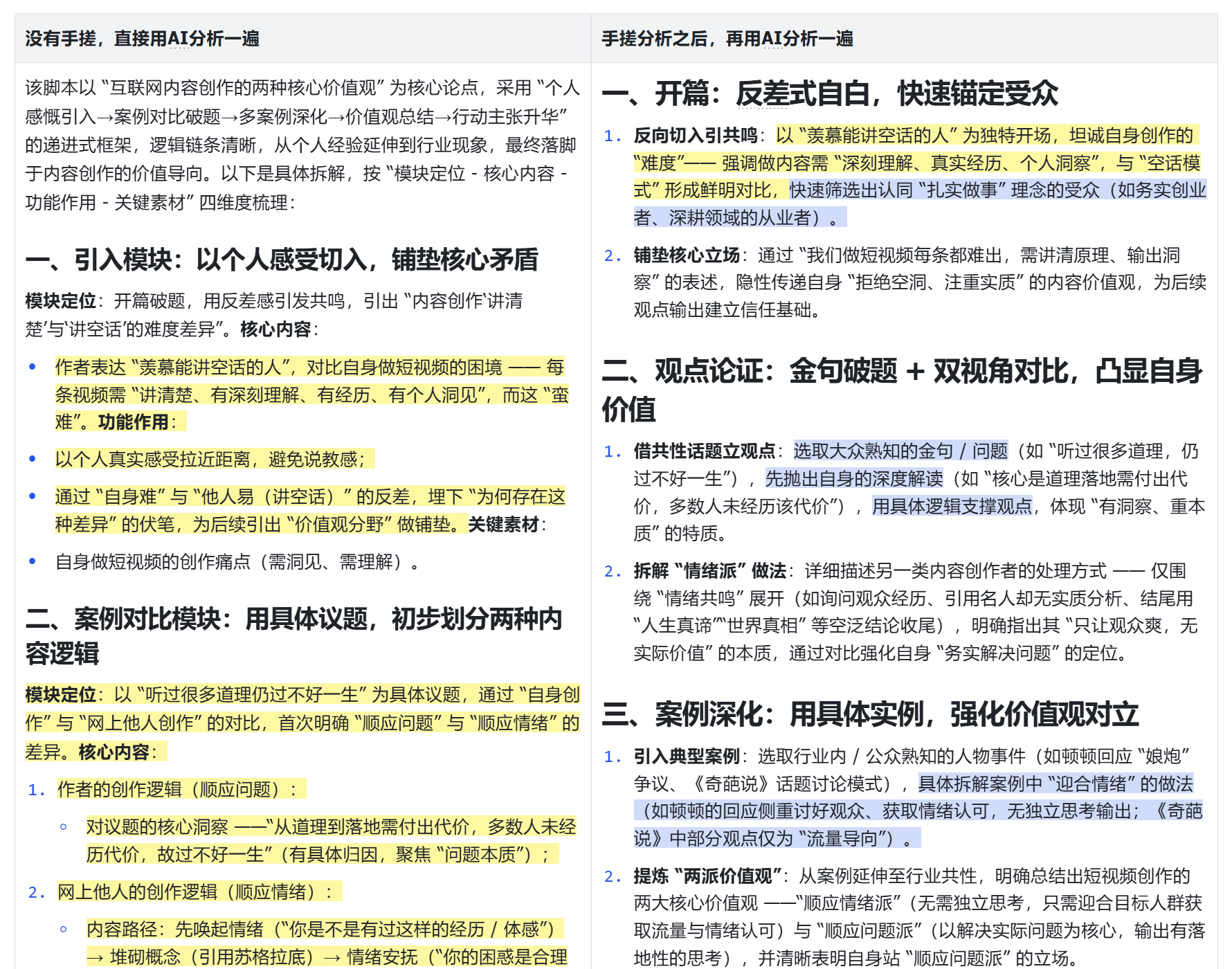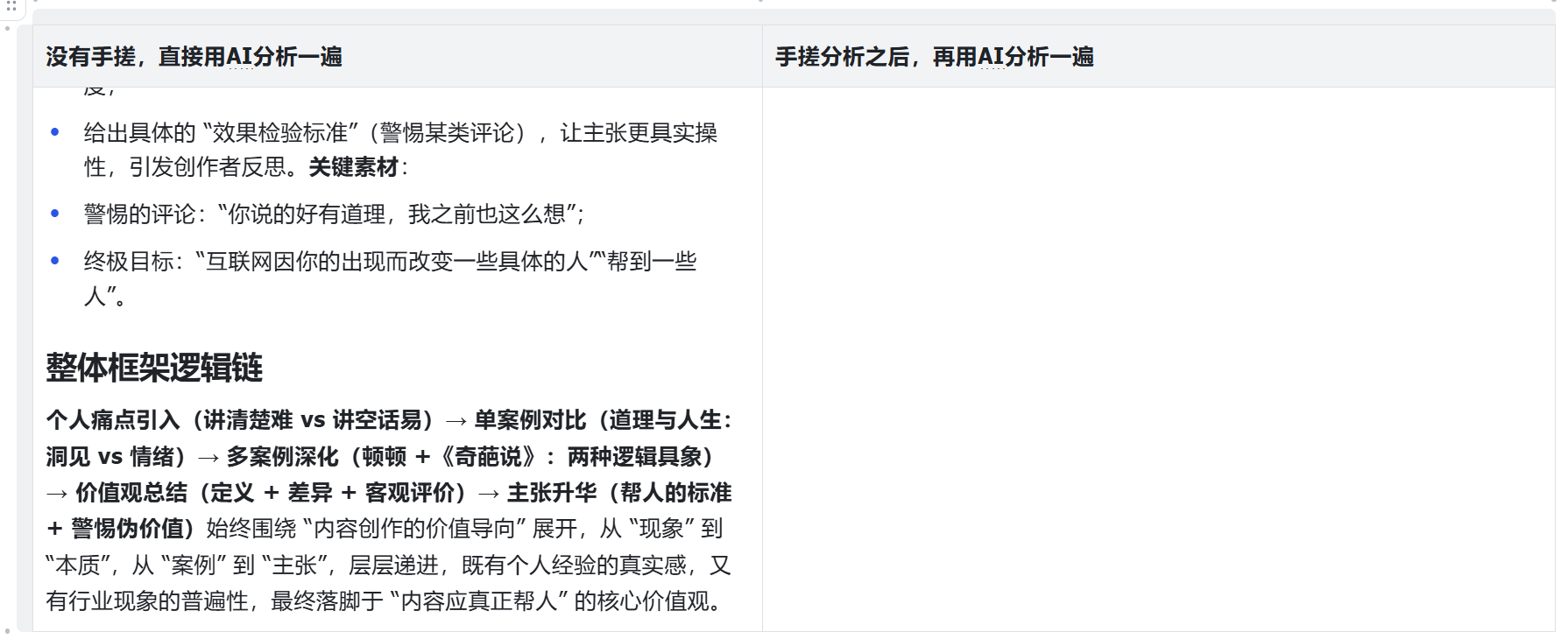 但如果是我们手搓之后,再投喂给AI去分析的内容,结构就特别清晰。