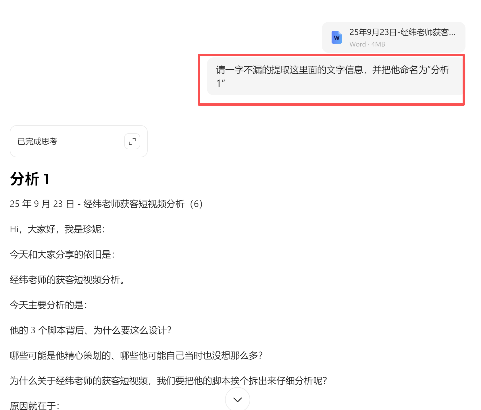 把“之前手搓过的、经纬老师短视频脚本中的分析”,用AI提取框架之后,