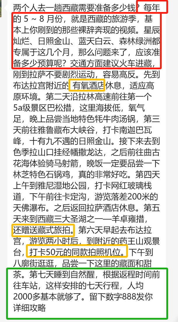 这种无比细腻的流程,不必在前端引流的时候就说给客户听,因为客户并不关心。他们只是想在短视频里看到:西藏有多美,住宿有多好,川藏旅行体验会多么疯狂或者肆意或者blabla,让他们觉得“不虚此行”。