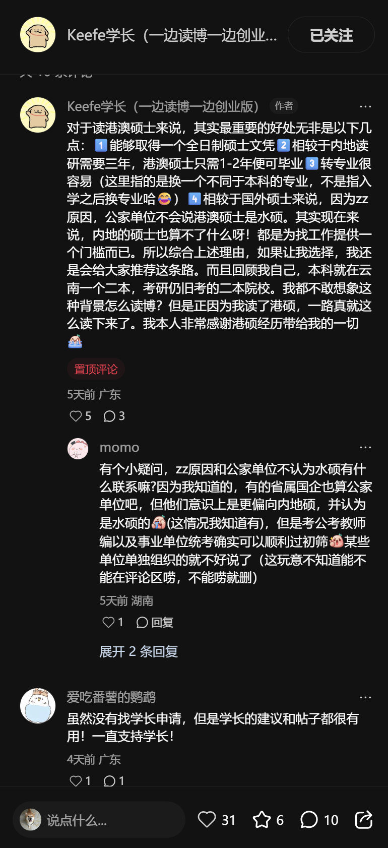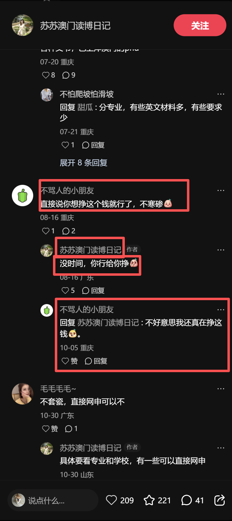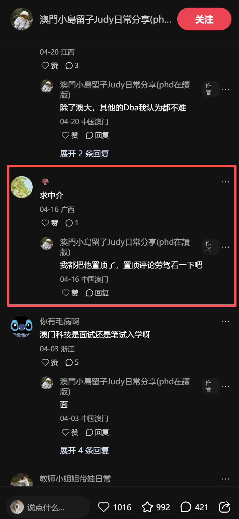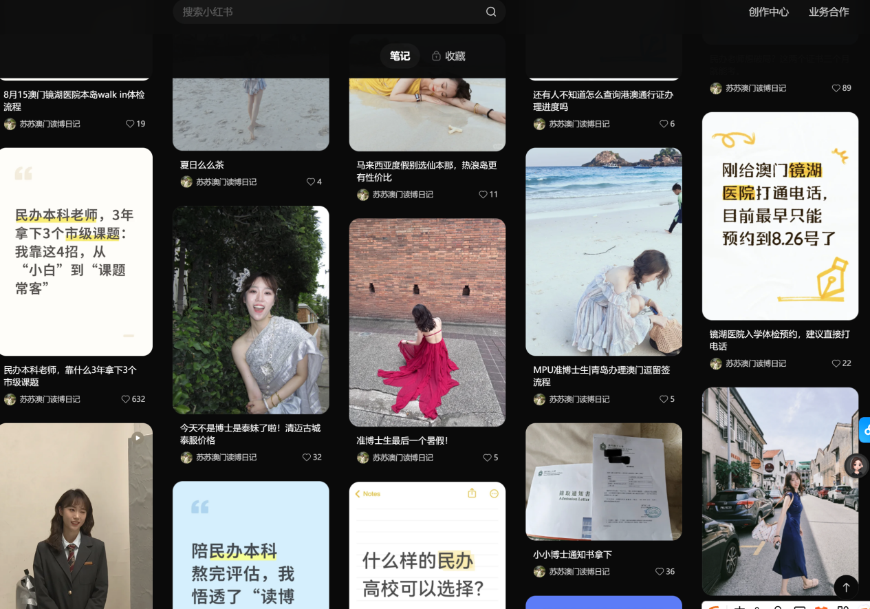 我们会发现:她主页内容非常丰富,她没有一直围绕澳门读博去写,而是一直在提民办高校的事情,