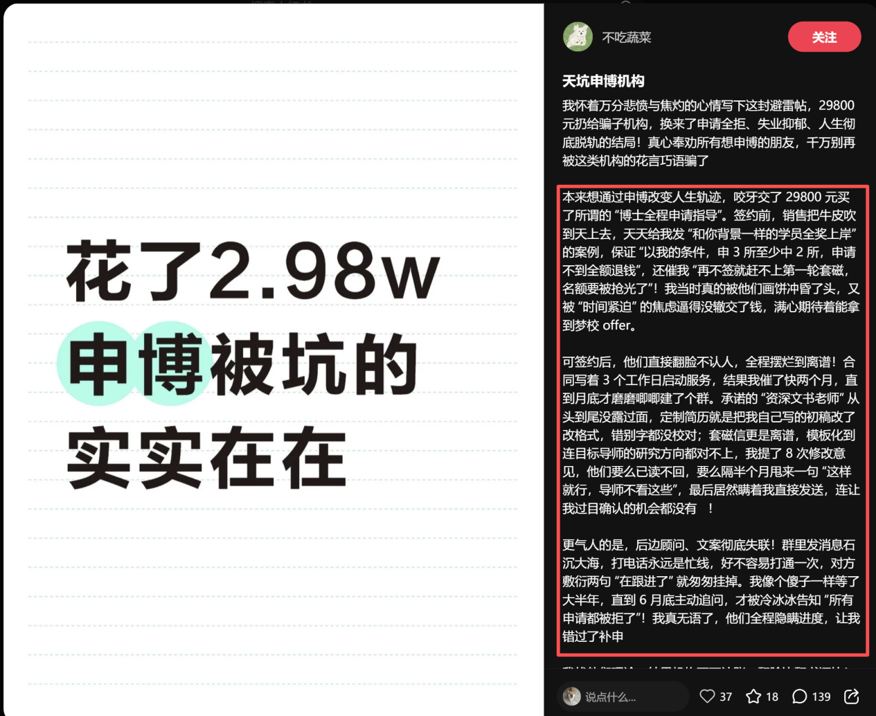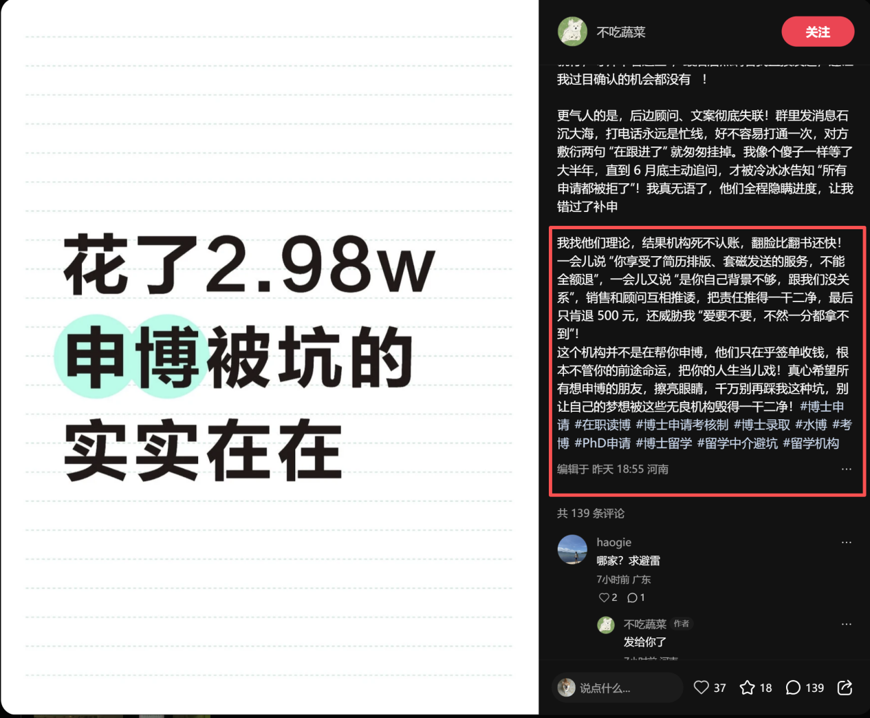自己在避雷某个机构后,终于大海捞针:找出了一家怎样怎样优秀的机构,然后晒自己拿到了博士录取通知书。