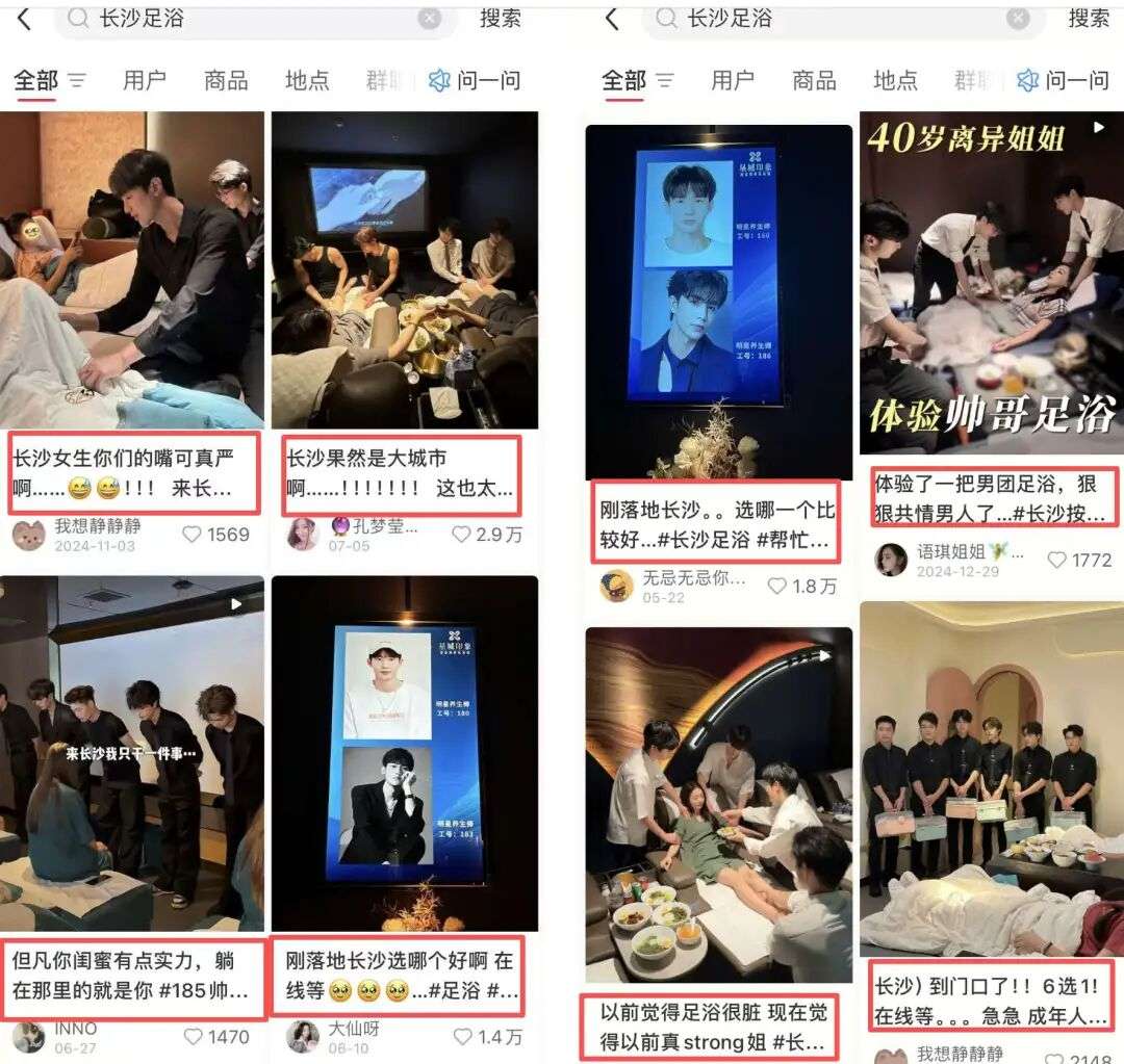 如下图,这是搜索“长沙足浴”能看到的小红书前两页的爆款: