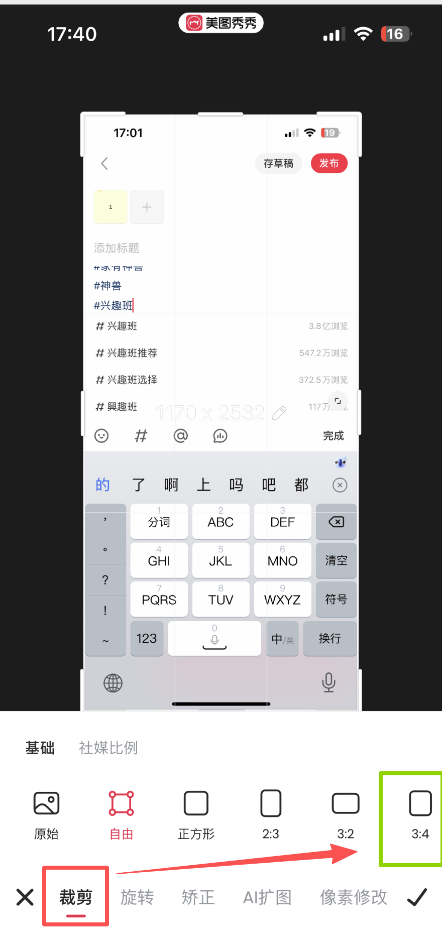 然后选中裁剪按钮,你就能看到下方绿圈处的“3:4”,你选择这个比例去裁剪就好啦。