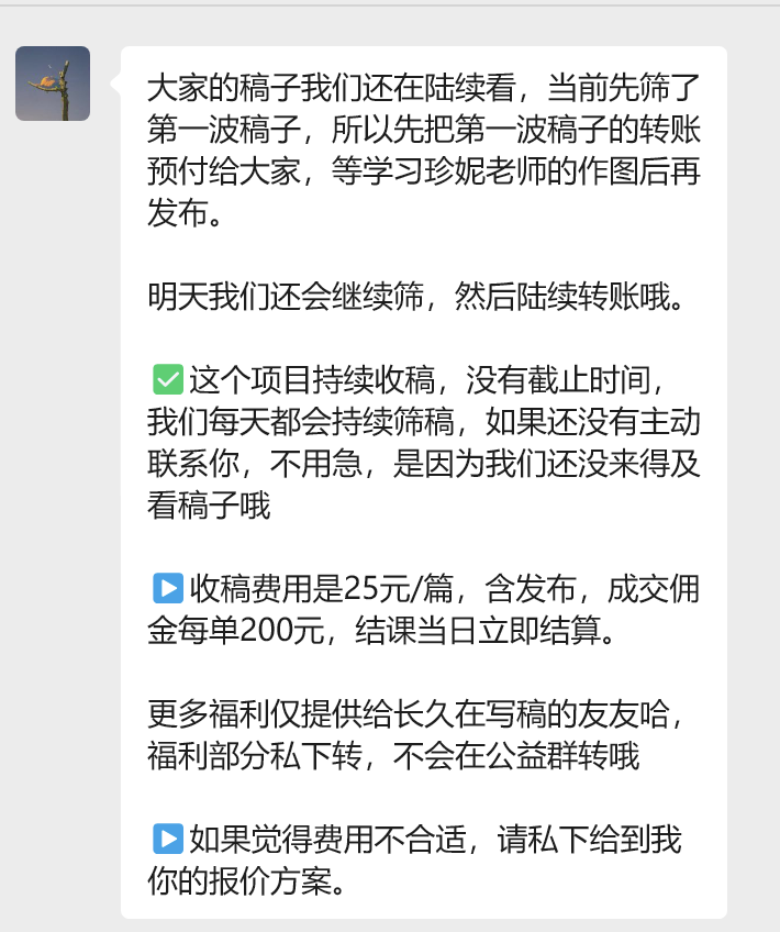 报价方案2:你对他给的基础费用不满意,你可以报你自己的价格,看邓总怎么说。如果他觉得你的价格可接受,但因为你刚开始写稿,他不想冒这个风险来收稿,所以他会等你把稿件发出去后,如果你的稿子来了一定量的客资(客资数量需要你们协商),且【客资是真实客资,不是水军的】情况下,他给按照你俩商量好的报价,给你付客资和签单提成。